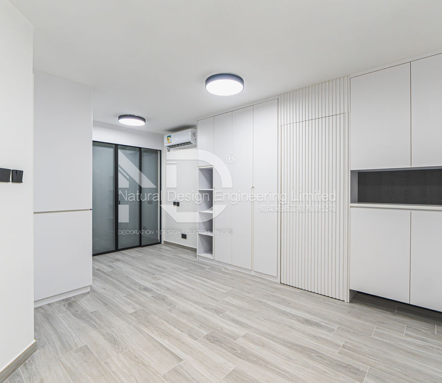 整體設計配色以單一色調為主,牆身等儲物櫃都採用白色為主,並適當地加入格柵條子增加層次感,不管是空間規劃還是傢俬設計都是以簡潔俐落為主。而地板亦利用明度較高的淺色調,配搭牆身等儲物櫃做到了提亮空間,簡潔明瞭的感覺,而之所以採用木地板則是為了可以令整個空間增加活力,不會過於冷調。