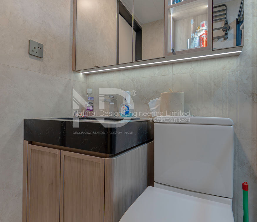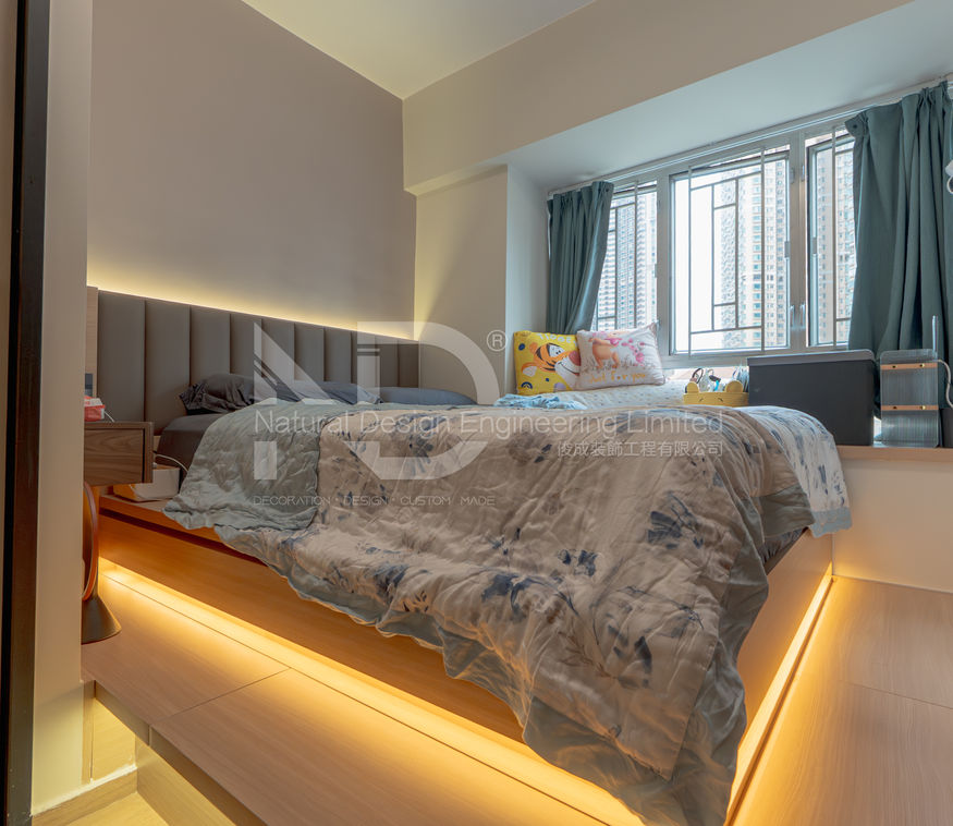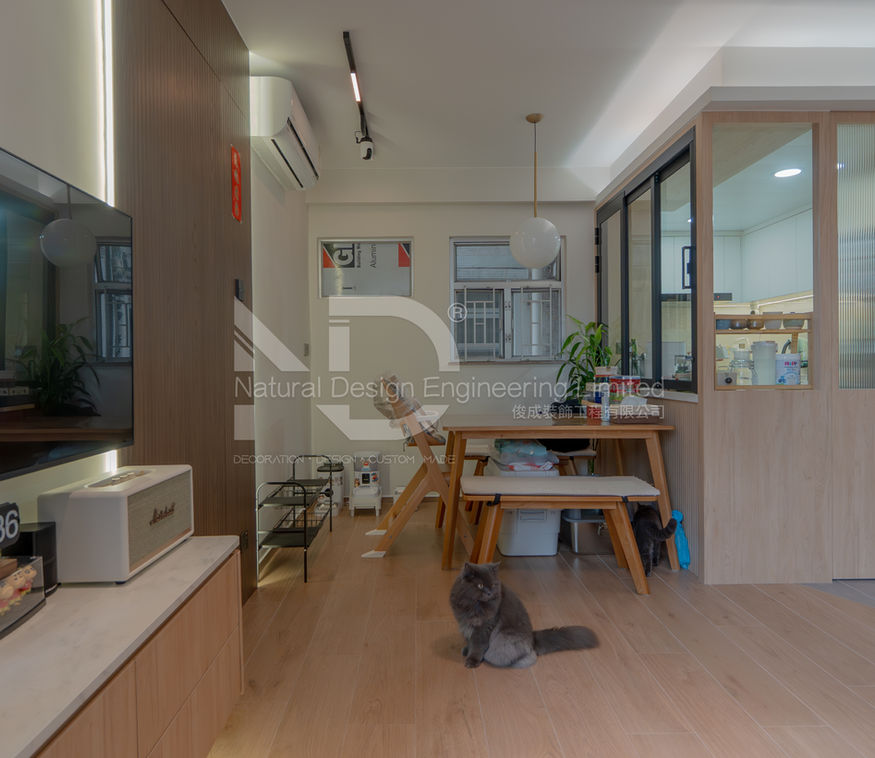 設計師在這個單位採用大量的自然深淺木色作主調,再加入低調柔和的色調來搭配,豐富視覺效果,同時亦不失溫暖感覺。另外設計師在廚房中使用了大面積的玻璃趟窗,更為靈活之餘,亦可令空間更為透光,增加空間明亮度與清爽感,生活也更加無壓。而房間則採用深木色為設計元素,從而呈現出較為靜謐的氛圍,地台床的設計,可以令睡床升高至窗台水平,同時亦可增加更多的收納空間,兼具實用與美感。