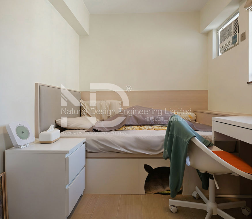 主人房床框做咗抽櫃+油壓式,平時唔常用嘅被鋪、枕頭可以塞入去,床頭仲做咗軟包靠背,返工返到攰,坐喺床度睇劇都舒服!床底櫃仲有埋貓貓專屬嘅睡房~