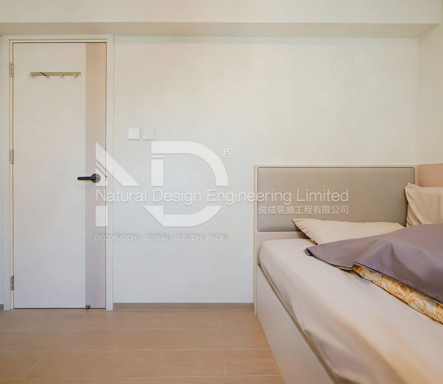 細房衣櫃做到頂,內部分層做咗「短衫格 + 長衫格 + 收納盒層」,門板同牆身色系一致,視覺上仲覺得空間闊咗!