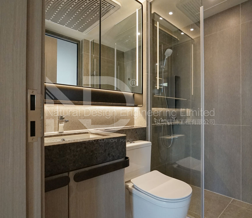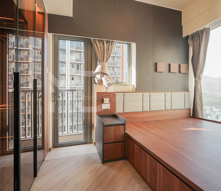 主人房做咗訂製地台,床底整排抽屜直接擴充收納空間;特意用咗三種唔同質感嘅板面拼接,帶紋理嘅牆板、平滑嘅櫃面、通透嘅玻璃飾櫃互相襯托;衣櫃同背景牆做埋一體,線條簡潔順滑;玻璃飾櫃都暗藏燈帶,擺返啲裝飾品即刻提升質感,美觀 + 機能二合一!