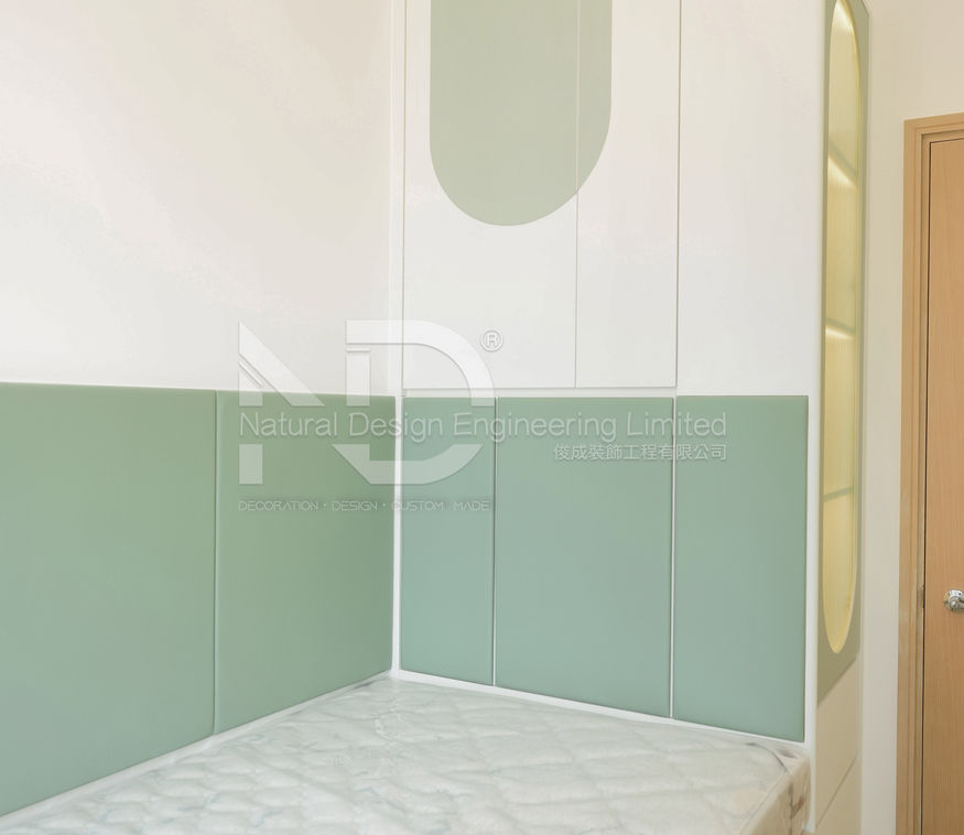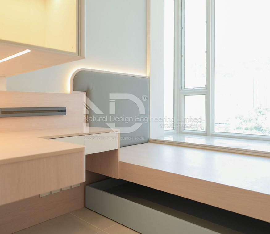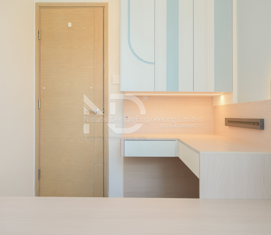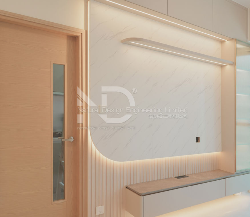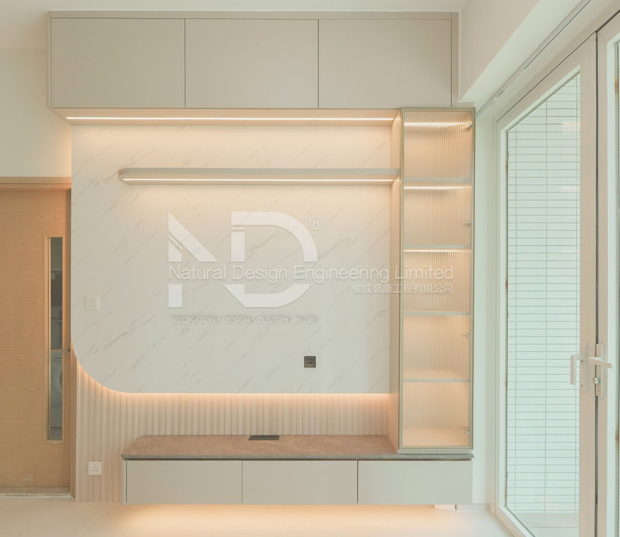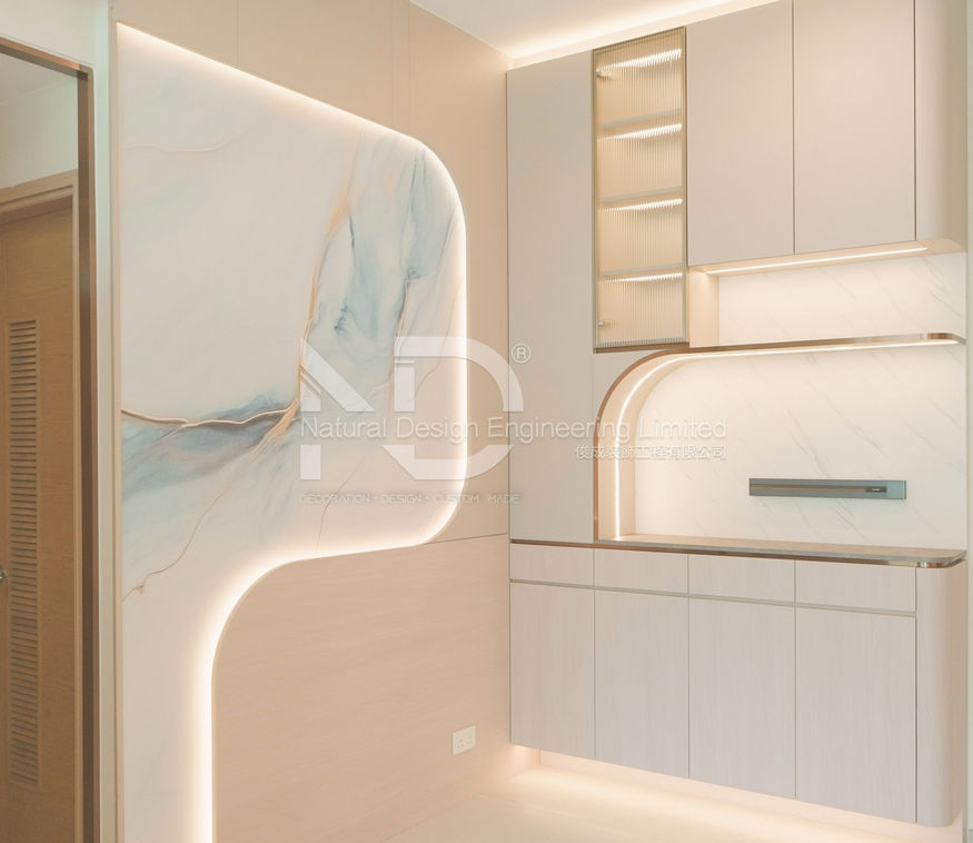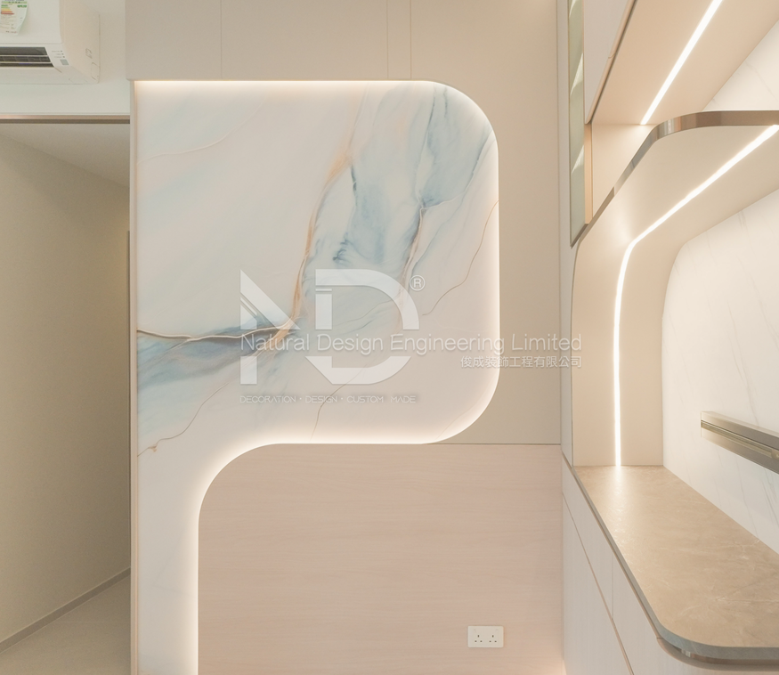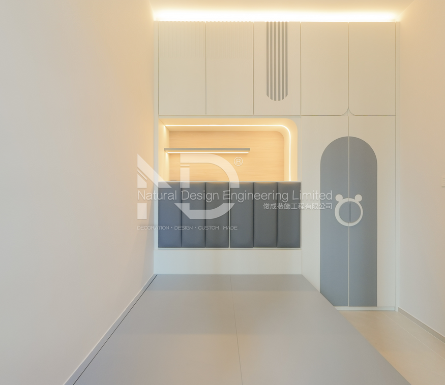 入門玄關以弧形線條貫穿設計,大理石紋理牆身搭配淺色系櫃體,再加埋暗藏燈光嘅層次感,簡約得嚟又充滿現代輕奢氣息~電視櫃同收納櫃一體化,仲有玻璃展示櫃擺返啲心水裝飾,細空間都可以好有格調~臥室區同樣驚喜滿滿!主人房嘅書桌櫃一體化設計,唔止慳位仲好實用~兒童房嘅弧形元素同可愛細節,色彩搭配清新又安全,小朋友住得開心,家長都放心~每間房嘅燈光運用都好講究,柔和光線營造舒適嘅休息氛圍。